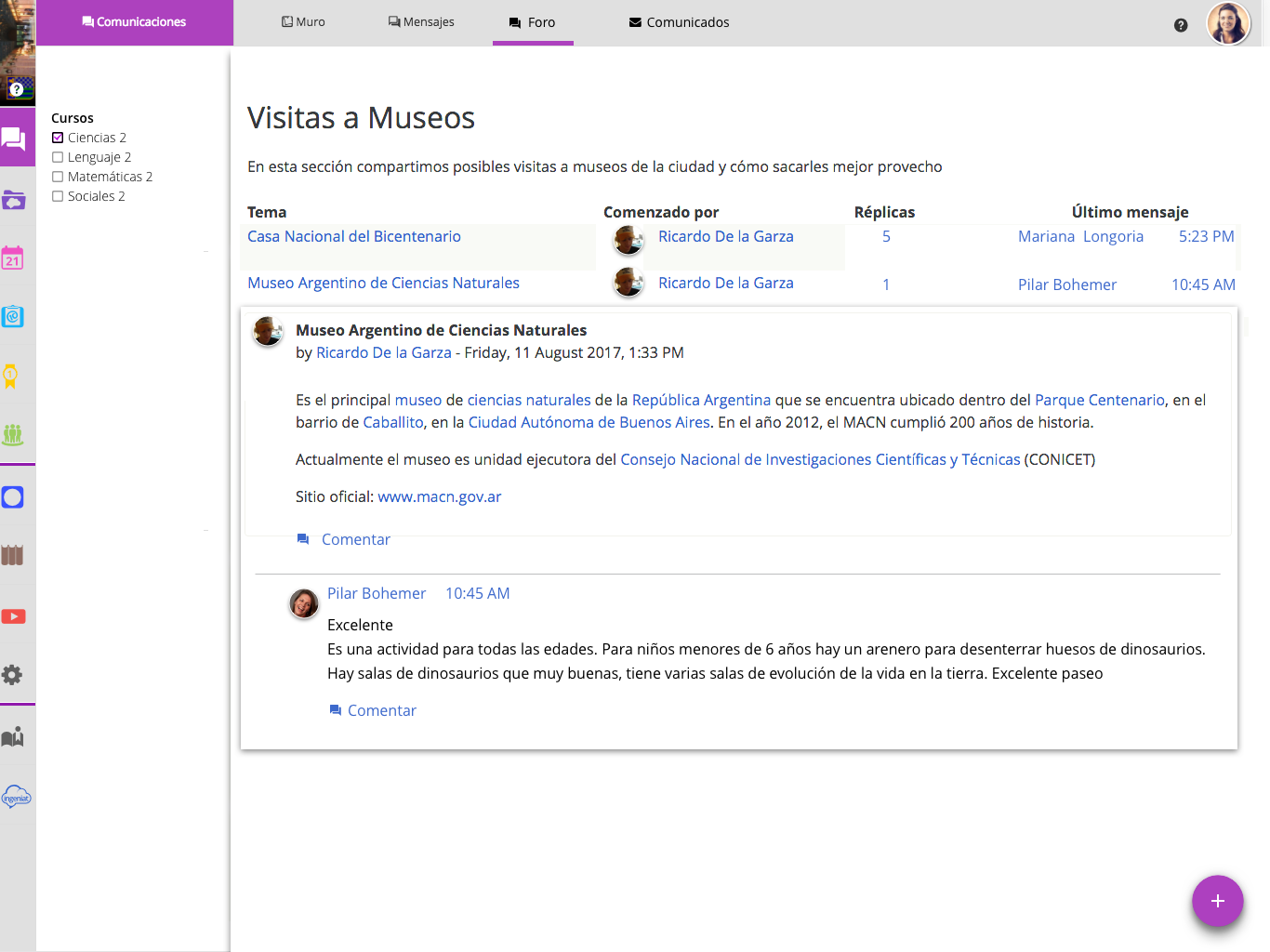 • Permite la creación de foros por asignatura para que todos los docentes de una misma asignatura puedan estar conectados e intercambiar recursos y experiencias creando un canal directo con el departamento de planeamiento del Ministerio logrando la mejora de planes de estudio, contenidos, capacitaciones y todo lo relacionado con la materia en cuestión.